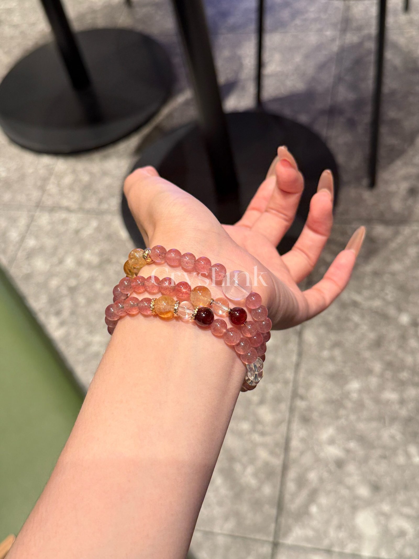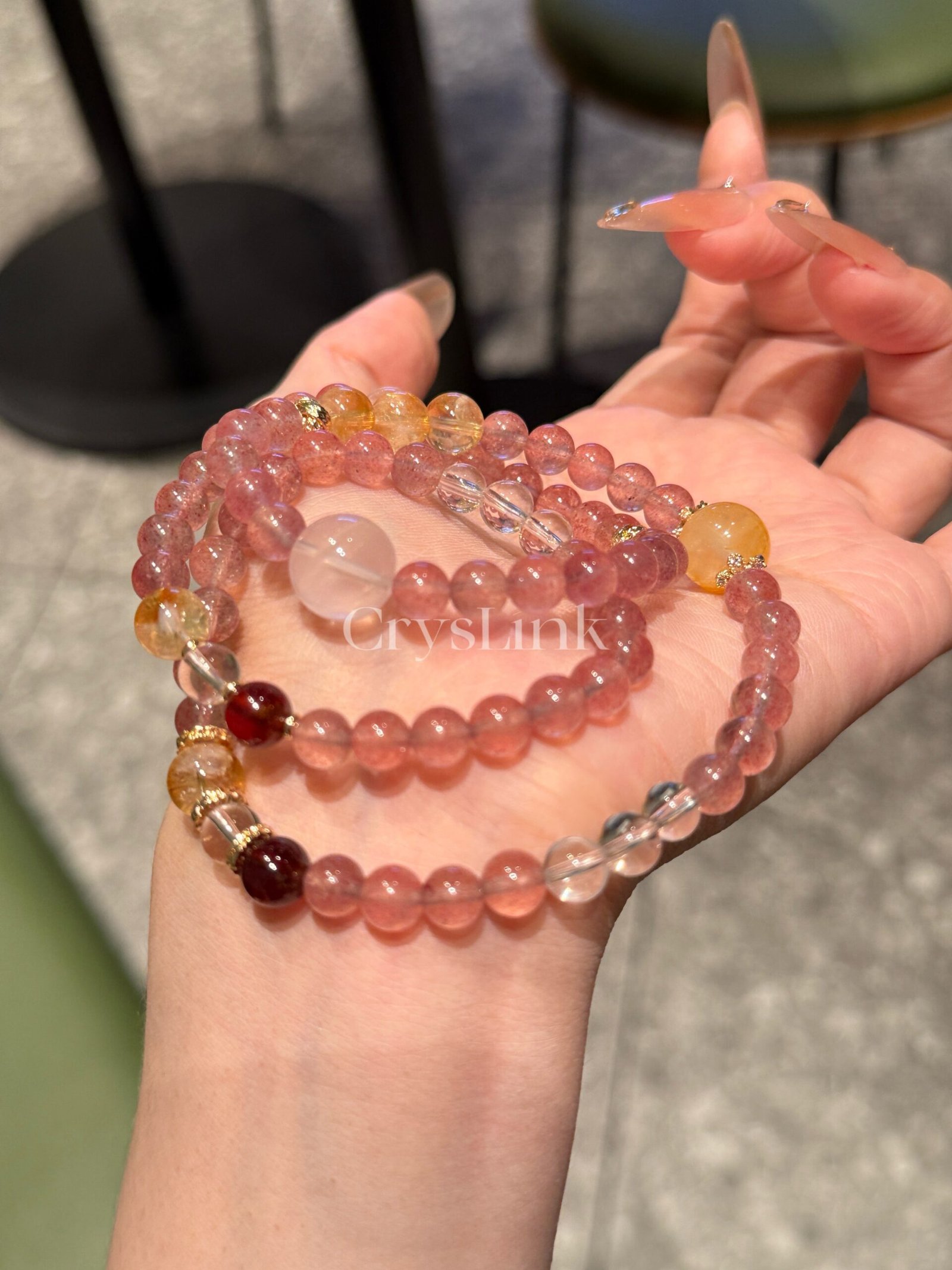 The “Princess Royale” triple-wrap bracelet is a delicate symphony of Strawberry Quartz, Rose Quartz, Citrine, Garnet, White Quartz, and golden inclusions. Each stone is hand-selected to amplify your natural allure, attract love and abundance, and soften your emotional energy. With its graceful glow and regal energy, this bracelet is designed for the modern empress – elegant, radiant, and deeply connected to her inner power.